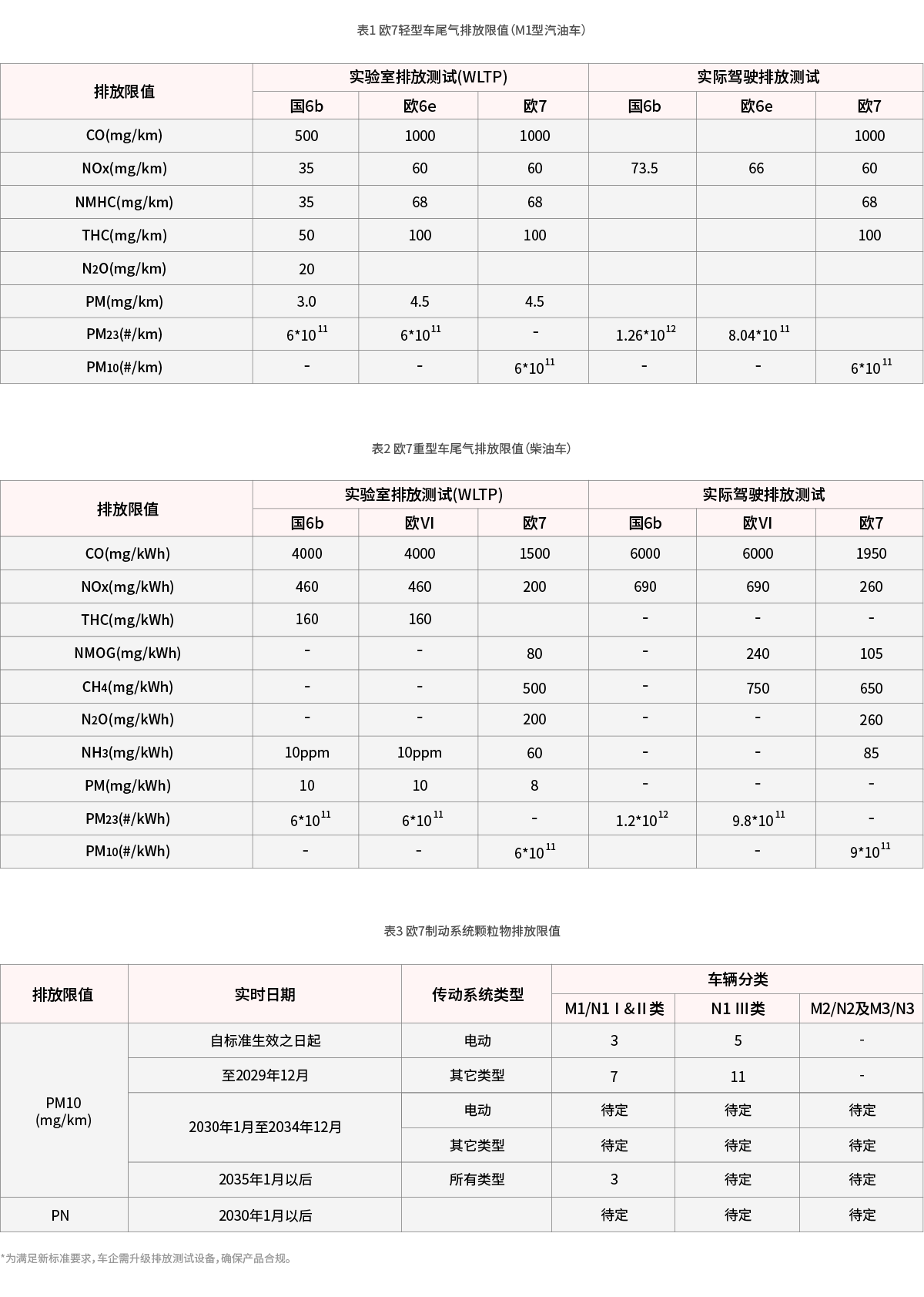 排放標準升級是機動車污染減排的主要驅(qū)動力。2024年歐盟發(fā)布的歐7標準不僅加嚴了尾氣污染物限值(表1-2),還新增了制動系統(tǒng)和輪胎顆粒物排放檢測要求(表3)。我國生態(tài)環(huán)境部自2020年啟動國七標準預研,目前第三期預研已進入標準制定階段,國七標準即將出臺。