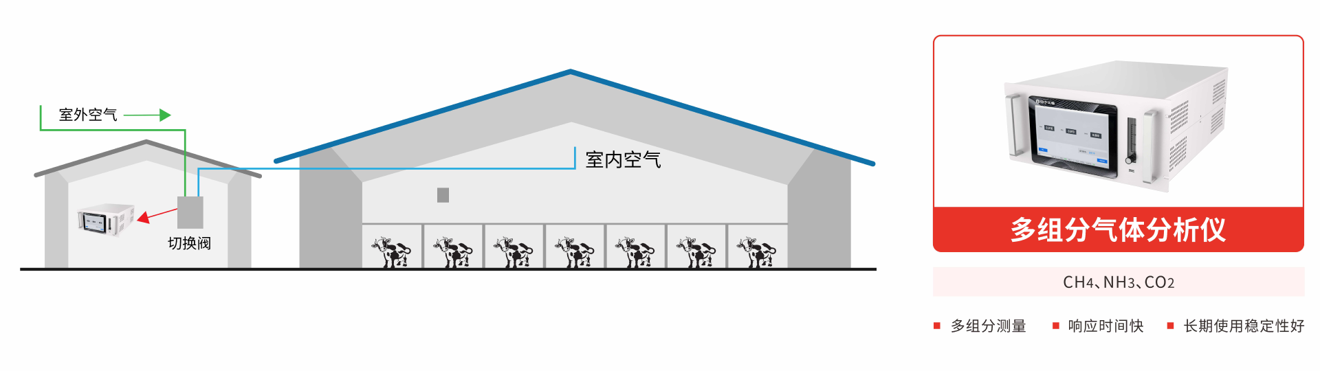 在線氣體分析儀可集成于位于畜舍外固定式監(jiān)測站房內(nèi)部,分析儀設(shè)置場外(環(huán)境空氣)和場內(nèi)(畜舍內(nèi)部)兩個獨立進樣口,通過三通電磁閥自動實現(xiàn)氣源切換,在線測量場內(nèi)和場外CH4、CO2,NH3等濃度,實時掌握養(yǎng)殖場環(huán)境信息,保障畜禽健康生長,同時為溫室氣體排放量核算提供準備的數(shù)據(jù)支撐。